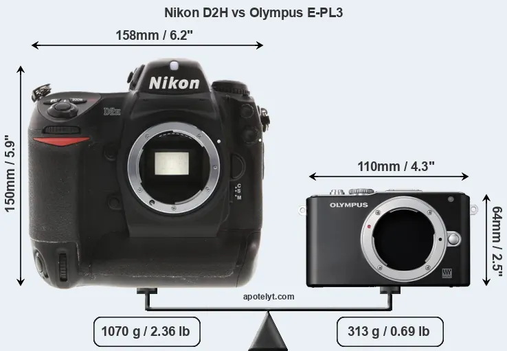 The side-by-side display below illustrates the physical size and weight of the Nikon D2H and the Olympus E-PL3. The two cameras are presented according to their relative size. Three successive views from the front, the top, and the rear are shown. All width, height and depth measures are rounded to the nearest millimeter.
