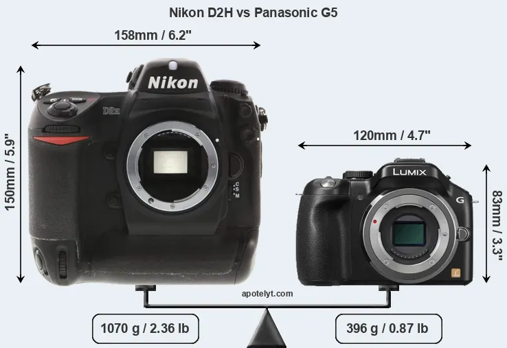 An illustration of the physical size and weight of the Nikon D2H and the Panasonic G5 is provided in the side-by-side display below. The two cameras are presented according to their relative size. Three successive views from the front, the top, and the rear are shown. All width, height and depth dimensions are rounded to the nearest millimeter.