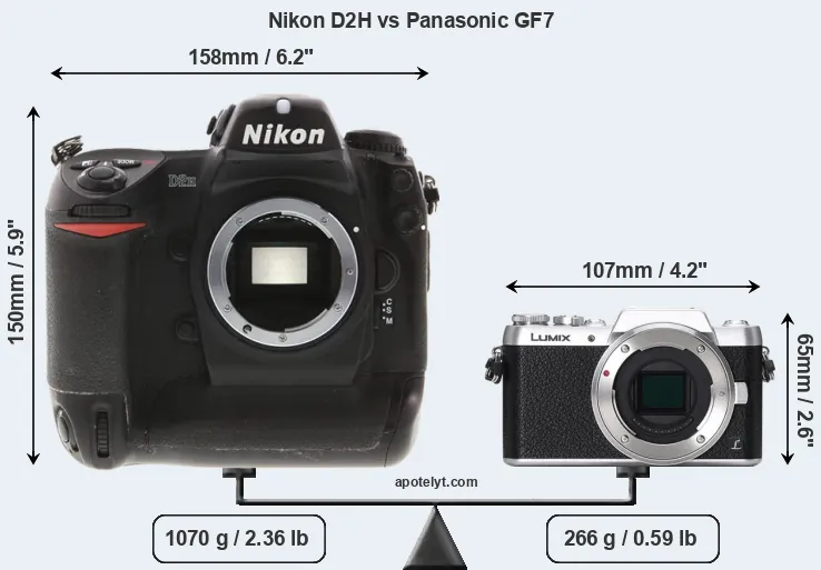 The side-by-side display below illustrates the physical size and weight of the Nikon D2H and the Panasonic GF7. The two cameras are presented according to their relative size. Three consecutive perspectives from the front, the top, and the back are available. All width, height and depth measures are rounded to the nearest millimeter.