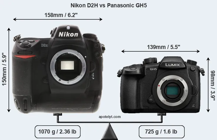 The side-by-side display below illustrates the physical size and weight of the Nikon D2H and the Panasonic GH5. The two cameras are presented according to their relative size. Three consecutive perspectives from the front, the top, and the back are available. All width, height and depth dimensions are rounded to the nearest millimeter.