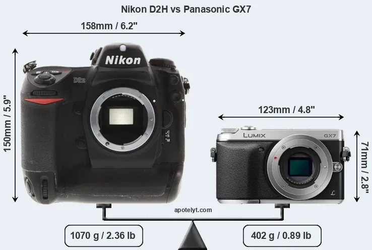 The side-by-side display below illustrates the physical size and weight of the Nikon D2H and the Panasonic GX7. The two cameras are presented according to their relative size. Three successive views from the front, the top, and the rear are shown. All width, height and depth measures are rounded to the nearest millimeter.