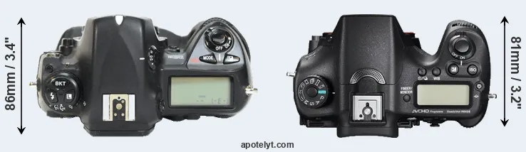 The physical size and weight of the Nikon D2H and the Sony A77 II are illustrated in the side-by-side display below. The two cameras are presented according to their relative size. Three consecutive perspectives from the front, the top, and the back are available. All size dimensions are rounded to the nearest millimeter.