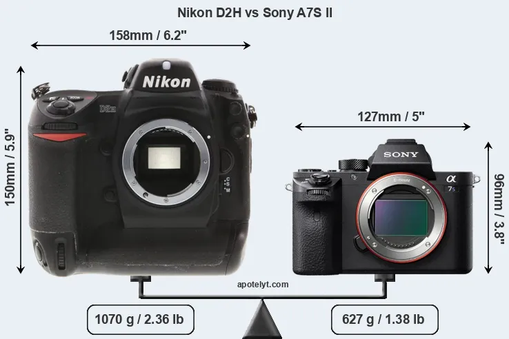 The side-by-side display below illustrates the physical size and weight of the Nikon D2H and the Sony A7S II. The two cameras are presented according to their relative size. Three consecutive views from the front, the top, and the rear side are shown. All width, height and depth measures are rounded to the nearest millimeter.