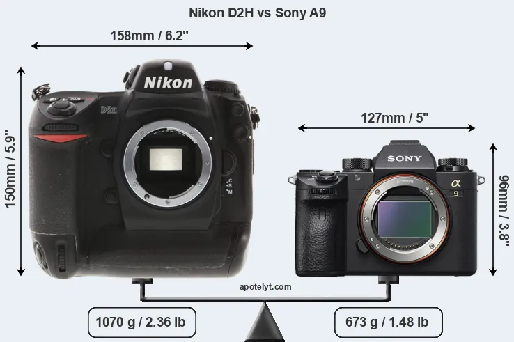 The Nikon D2H and the Sony Alpha A9 are two professional cameras that were revealed to the public, respectively, in July 2003 and April 2017. The D2H is a DSLR, while the A9 is a mirrorless interchangeable lens camera. The cameras are based on an APS-C (D2H) and a full frame (A9) sensor. The Nikon has a resolution of 4 megapixels, whereas the Sony provides 24 MP.