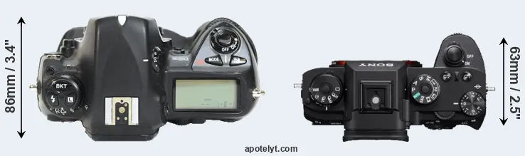 The physical size and weight of the Nikon D2H and the Sony A9 are illustrated in the side-by-side display below. The two cameras are presented according to their relative size. Three successive views from the front, the top, and the rear are shown. All size dimensions are rounded to the nearest millimeter.