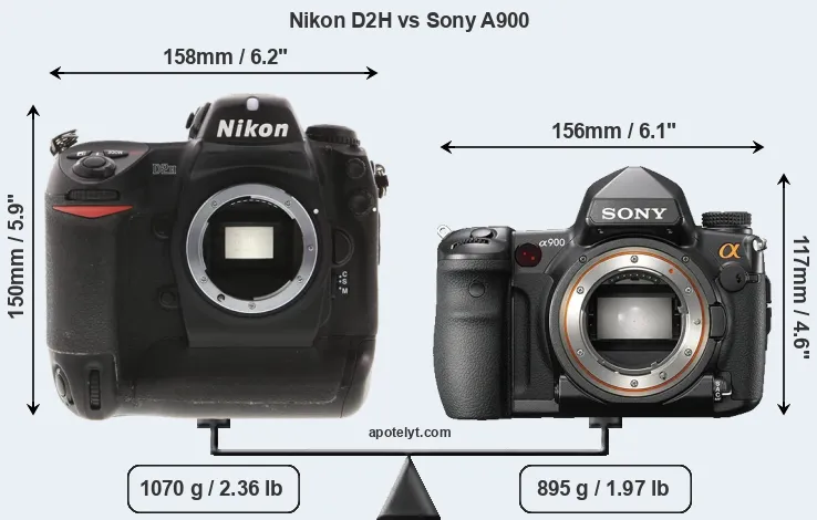 The physical size and weight of the Nikon D2H and the Sony A900 are illustrated in the side-by-side display below. The two cameras are presented according to their relative size. Three successive views from the front, the top, and the rear are shown. All size dimensions are rounded to the nearest millimeter.