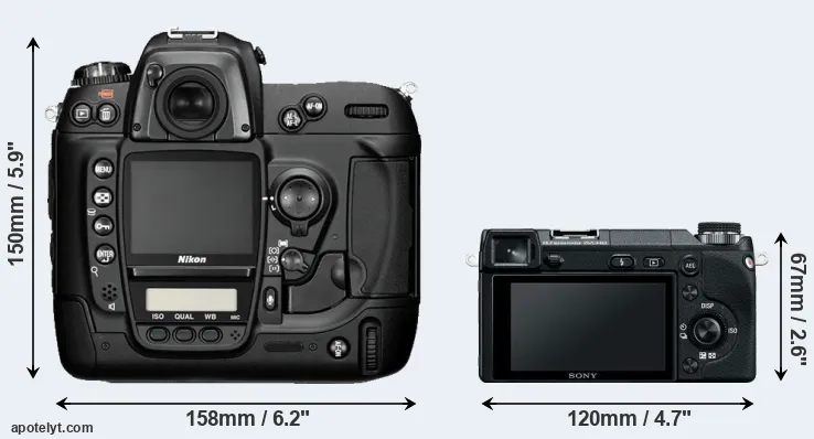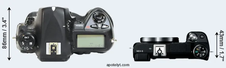 The side-by-side display below illustrates the physical size and weight of the Nikon D2H and the Sony NEX-6. The two cameras are presented according to their relative size. Three consecutive perspectives from the front, the top, and the back are available. All size dimensions are rounded to the nearest millimeter.