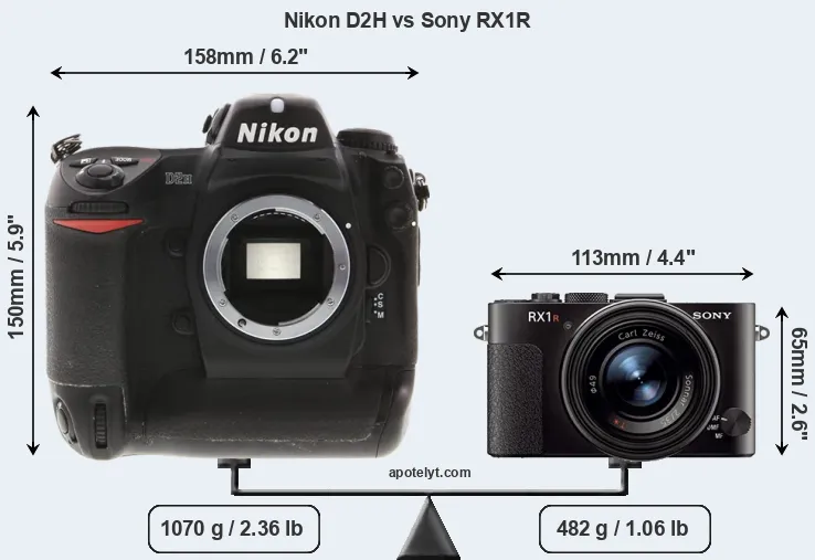The Nikon D2H and the Sony Cyber-shot DSC-RX1R are two digital cameras that were officially introduced, respectively, in July 2003 and June 2013. The D2H is a DSLR, while the RX1R is a fixed lens compact. The cameras are based on an APS-C (D2H) and a full frame (RX1R) sensor. The Nikon has a resolution of 4 megapixels, whereas the Sony provides 24 MP.