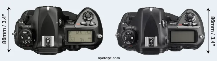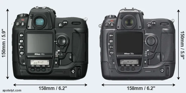 The side-by-side display below illustrates the physical size and weight of the Nikon D2X and the Nikon D2Xs. The two cameras are presented according to their relative size. Three consecutive perspectives from the front, the top, and the back are available. All size dimensions are rounded to the nearest millimeter.