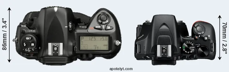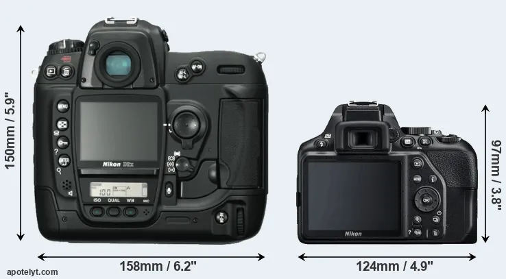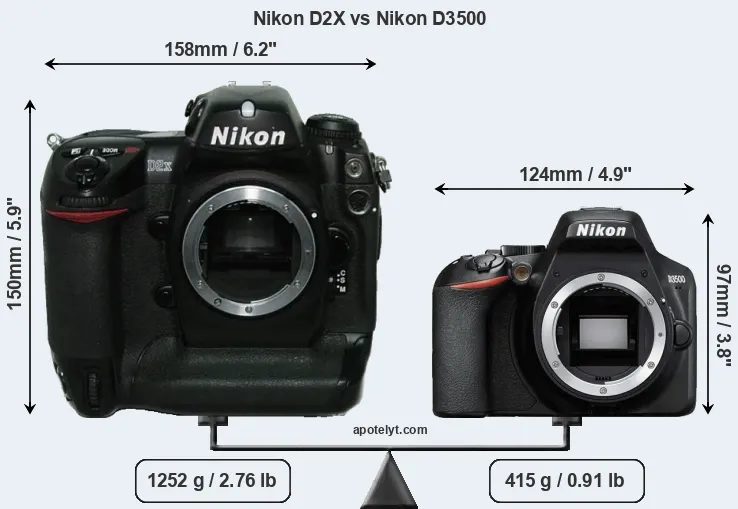 The physical size and weight of the Nikon D2X and the Nikon D3500 are illustrated in the side-by-side display below. The two cameras are presented according to their relative size. Three consecutive perspectives from the front, the top, and the back are available. All width, height and depth dimensions are rounded to the nearest millimeter.