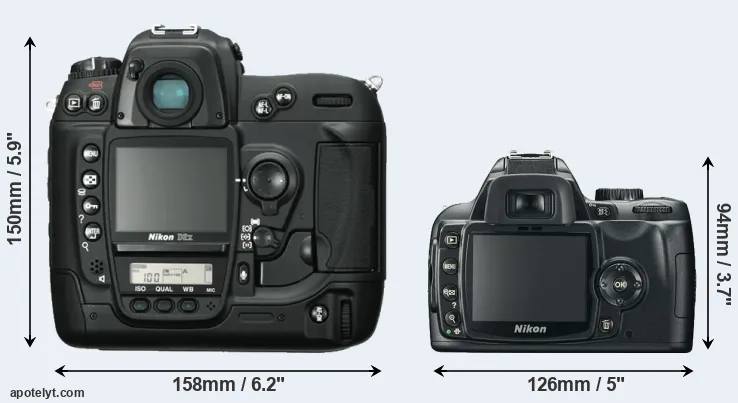 | 7. | Nikon D2Xs | 158 mm | 150 mm | 86 mm | 1252 g | 3800 | Y | Jun 2006 | US$ 4 699 | ebay.com | |