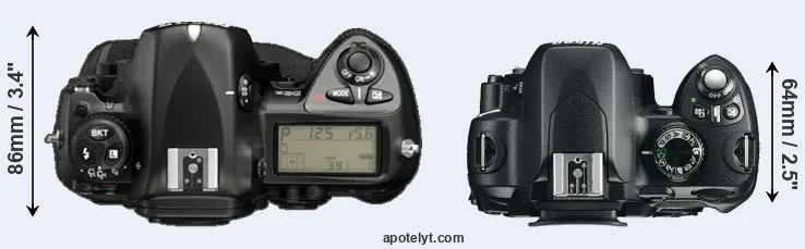 An illustration of the physical size and weight of the Nikon D2X and the Nikon D60 is provided in the side-by-side display below. The two cameras are presented according to their relative size. Three consecutive perspectives from the front, the top, and the back are available. All size dimensions are rounded to the nearest millimeter.