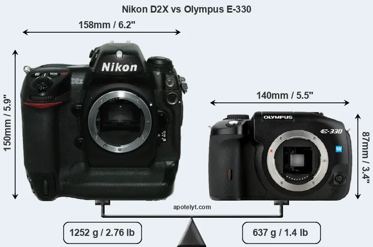 An illustration of the physical size and weight of the Nikon D2X and the Olympus E-330 is provided in the side-by-side display below. The two cameras are presented according to their relative size. Three successive views from the front, the top, and the rear are shown. All width, height and depth dimensions are rounded to the nearest millimeter.