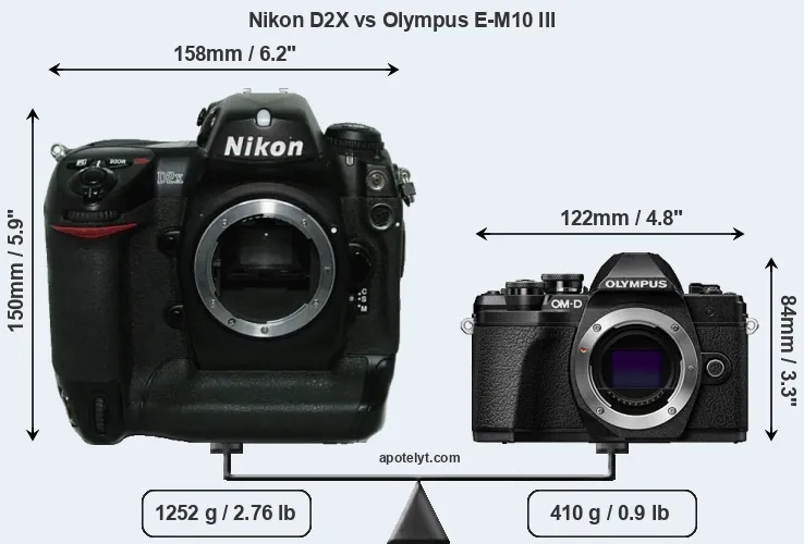 The side-by-side display below illustrates the physical size and weight of the Nikon D2X and the Olympus E-M10 III. The two cameras are presented according to their relative size. Three consecutive perspectives from the front, the top, and the back are available. All width, height and depth dimensions are rounded to the nearest millimeter.