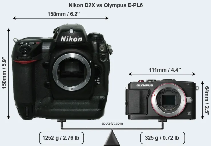 The physical size and weight of the Nikon D2X and the Olympus E-PL6 are illustrated in the side-by-side display below. The two cameras are presented according to their relative size. Three consecutive perspectives from the front, the top, and the back are available. All size dimensions are rounded to the nearest millimeter.