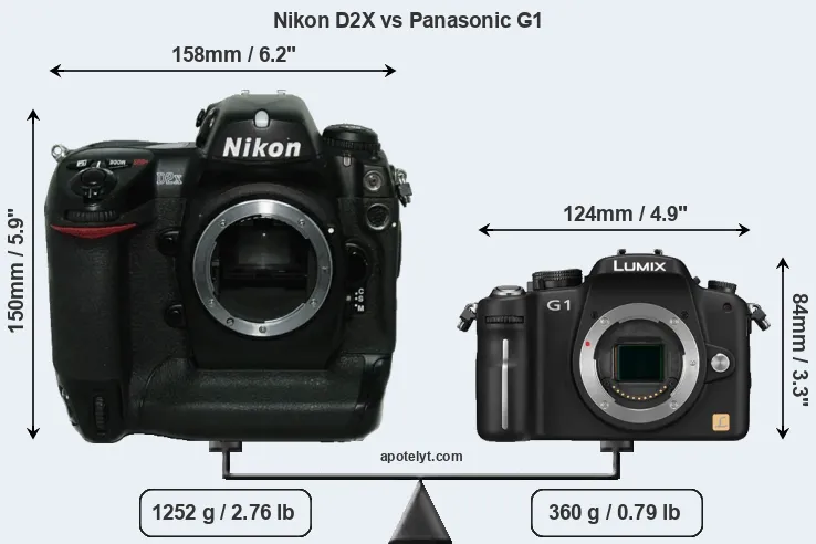 If the front view area (width x height) of the cameras is taken as an aggregate measure of their size, the Panasonic G1 is considerably smaller (56 percent) than the Nikon D2X. Moreover, the G1 is substantially lighter (71 percent) than the D2X. It is worth mentioning in this context that the D2X is splash and dust resistant, while the G1 does not feature any corresponding weather-sealing.
