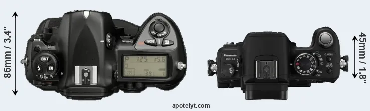 An illustration of the physical size and weight of the Nikon D2X and the Panasonic G1 is provided in the side-by-side display below. The two cameras are presented according to their relative size. Three consecutive views from the front, the top, and the rear side are shown. All width, height and depth measures are rounded to the nearest millimeter.