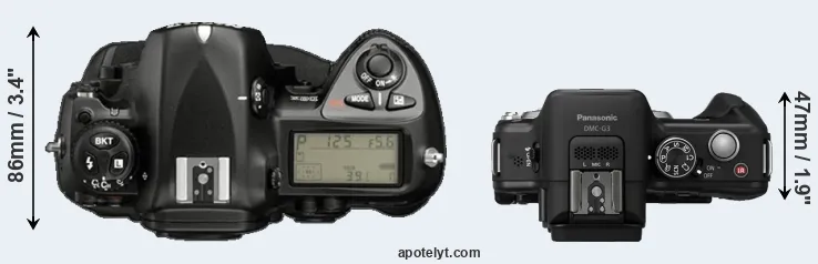 The side-by-side display below illustrates the physical size and weight of the Nikon D2X and the Panasonic G3. The two cameras are presented according to their relative size. Three successive views from the front, the top, and the rear are shown. All width, height and depth measures are rounded to the nearest millimeter.