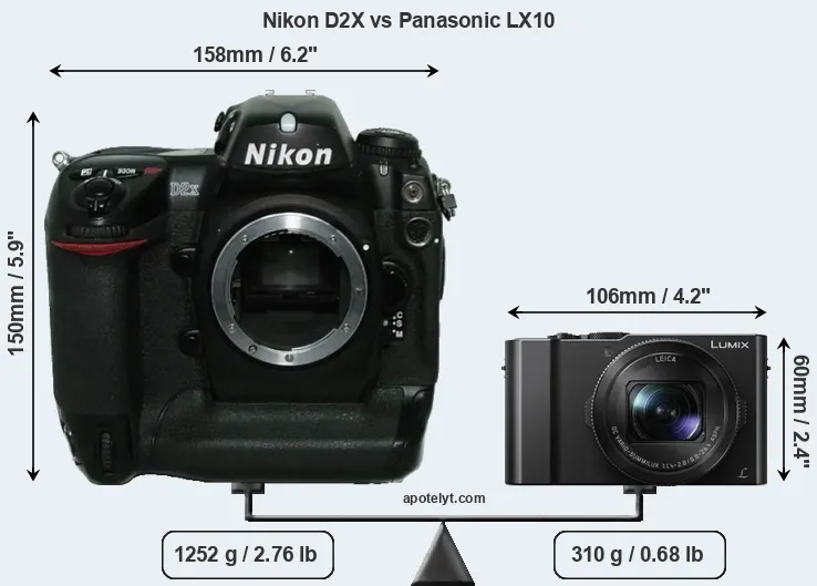 An illustration of the physical size and weight of the Nikon D2X and the Panasonic LX10 is provided in the side-by-side display below. The two cameras are presented according to their relative size. Three successive views from the front, the top, and the rear are shown. All width, height and depth dimensions are rounded to the nearest millimeter.