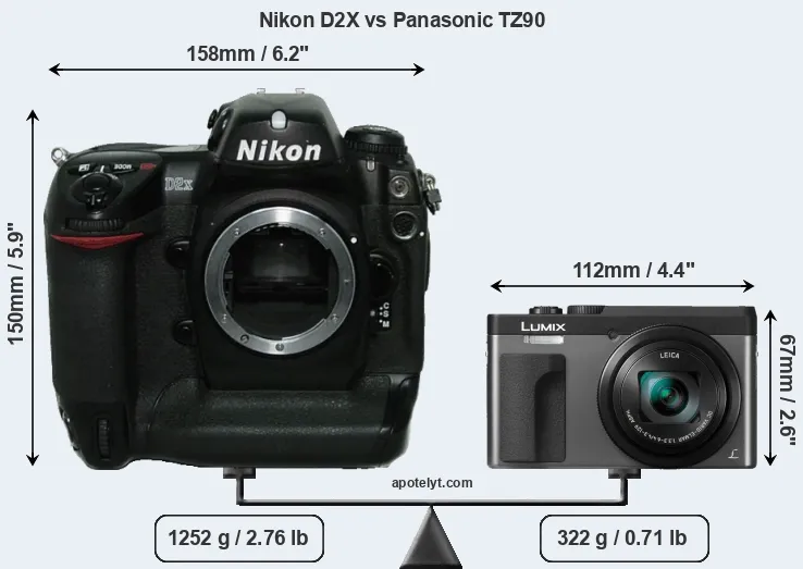 The above size and weight comparisons are to some extent incomplete and possibly misleading, as the TZ90 has a lens built in, whereas the D2X is an interchangeable lens camera that requires a separate lens. Attaching the latter will add extra weight and bulk to the setup. You can compare the optics available for the D2X and their specifications in the Nikon Lens Catalog.