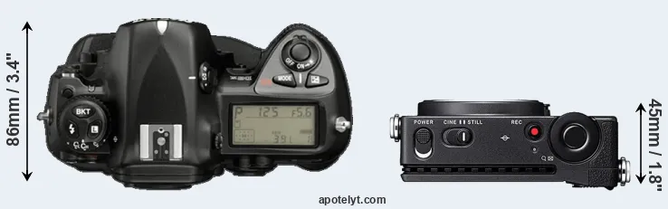 An illustration of the physical size and weight of the Nikon D2X and the Sigma fp is provided in the side-by-side display below. The two cameras are presented according to their relative size. Three consecutive views from the front, the top, and the rear side are shown. All size dimensions are rounded to the nearest millimeter.