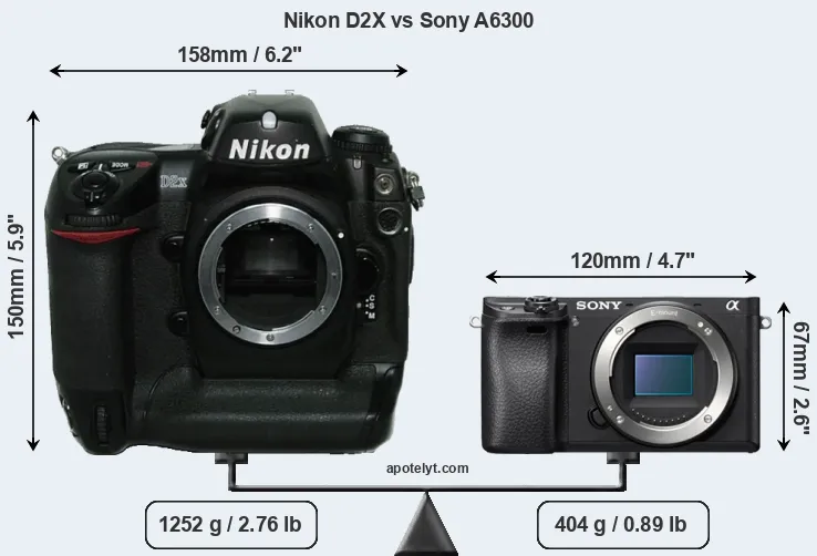 An illustration of the physical size and weight of the Nikon D2X and the Sony A6300 is provided in the side-by-side display below. The two cameras are presented according to their relative size. Three successive views from the front, the top, and the rear are shown. All width, height and depth dimensions are rounded to the nearest millimeter.