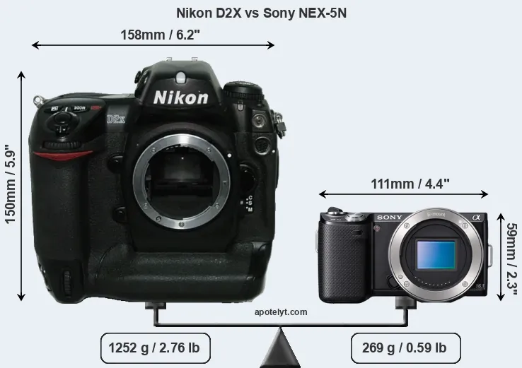 The side-by-side display below illustrates the physical size and weight of the Nikon D2X and the Sony NEX-5N. The two cameras are presented according to their relative size. Three consecutive views from the front, the top, and the rear side are shown. All width, height and depth dimensions are rounded to the nearest millimeter.