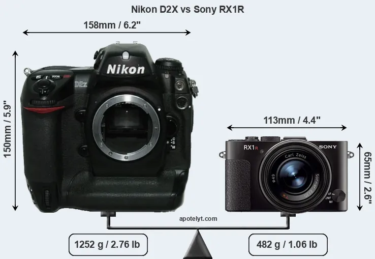 The side-by-side display below illustrates the physical size and weight of the Nikon D2X and the Sony RX1R. The two cameras are presented according to their relative size. Three successive views from the front, the top, and the rear are shown. All width, height and depth dimensions are rounded to the nearest millimeter.