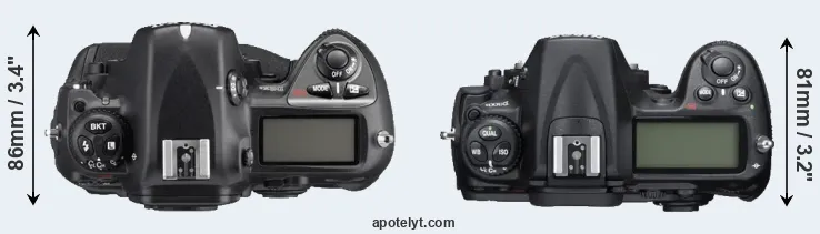An illustration of the physical size and weight of the Nikon D2Xs and the Nikon D300S is provided in the side-by-side display below. The two cameras are presented according to their relative size. Three successive views from the front, the top, and the rear are shown. All size dimensions are rounded to the nearest millimeter.