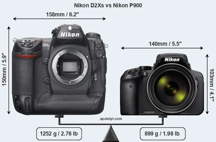 An illustration of the physical size and weight of the Nikon D2Xs and the Nikon P900 is provided in the side-by-side display below. The two cameras are presented according to their relative size. Three consecutive views from the front, the top, and the rear side are shown. All size dimensions are rounded to the nearest millimeter.