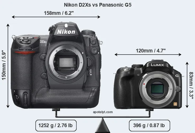 If the front view area (width x height) of the cameras is taken as an aggregate measure of their size, the Panasonic G5 is considerably smaller (58 percent) than the Nikon D2Xs. Moreover, the G5 is substantially lighter (68 percent) than the D2Xs. It is worth mentioning in this context that the D2Xs is splash and dust resistant, while the G5 does not feature any corresponding weather-sealing.