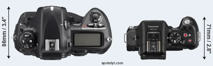 The physical size and weight of the Nikon D2Xs and the Panasonic G5 are illustrated in the side-by-side display below. The two cameras are presented according to their relative size. Three successive views from the front, the top, and the rear are shown. All size dimensions are rounded to the nearest millimeter.