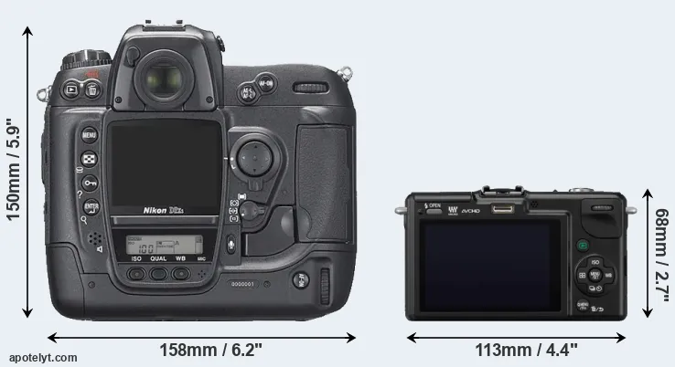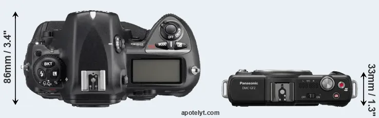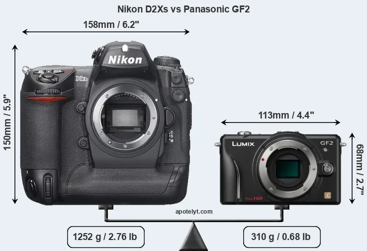 An illustration of the physical size and weight of the Nikon D2Xs and the Panasonic GF2 is provided in the side-by-side display below. The two cameras are presented according to their relative size. Three consecutive perspectives from the front, the top, and the back are available. All width, height and depth dimensions are rounded to the nearest millimeter.