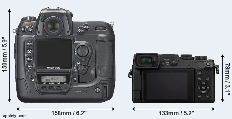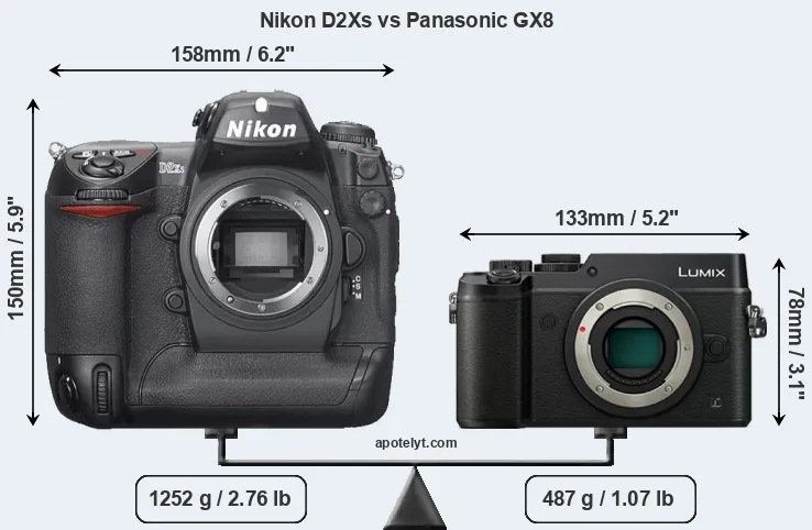 The side-by-side display below illustrates the physical size and weight of the Nikon D2Xs and the Panasonic GX8. The two cameras are presented according to their relative size. Three successive views from the front, the top, and the rear are shown. All size dimensions are rounded to the nearest millimeter.