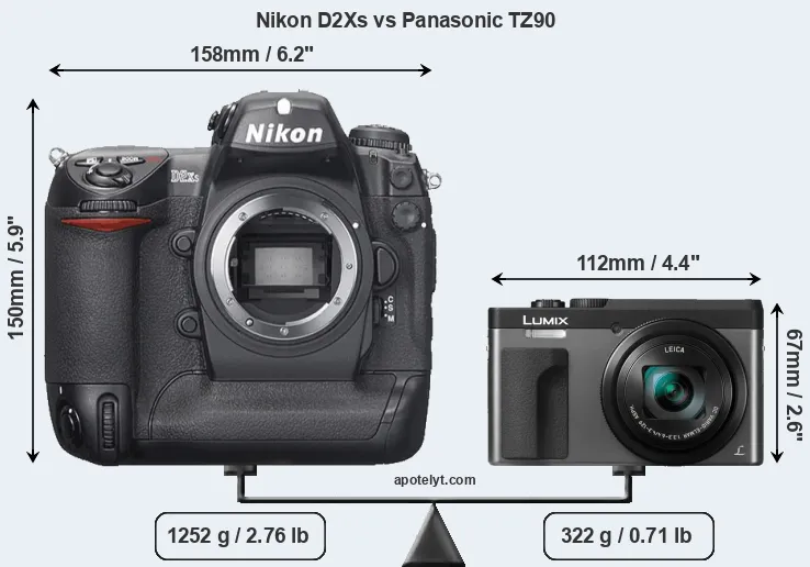 If the front view area (width x height) of the cameras is taken as an aggregate measure of their size, the Panasonic TZ90 is considerably smaller (68 percent) than the Nikon D2Xs. It is worth mentioning in this context that the D2Xs is splash and dust resistant, while the TZ90 does not feature any corresponding weather-sealing.