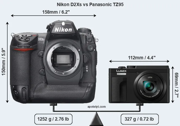 The side-by-side display below illustrates the physical size and weight of the Nikon D2Xs and the Panasonic TZ95. The two cameras are presented according to their relative size. Three successive views from the front, the top, and the rear are shown. All size dimensions are rounded to the nearest millimeter.