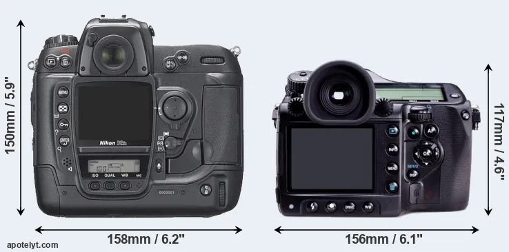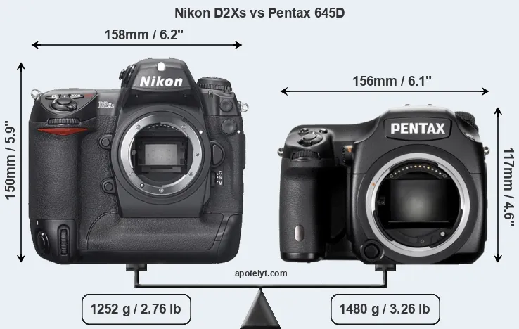 The physical size and weight of the Nikon D2Xs and the Pentax 645D are illustrated in the side-by-side display below. The two cameras are presented according to their relative size. Three consecutive perspectives from the front, the top, and the back are available. All width, height and depth dimensions are rounded to the nearest millimeter.