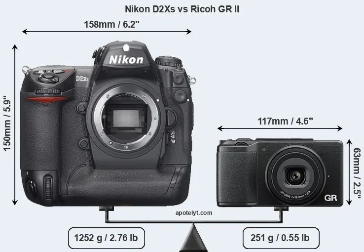 The side-by-side display below illustrates the physical size and weight of the Nikon D2Xs and the Ricoh GR II. The two cameras are presented according to their relative size. Three successive views from the front, the top, and the rear are shown. All width, height and depth measures are rounded to the nearest millimeter.