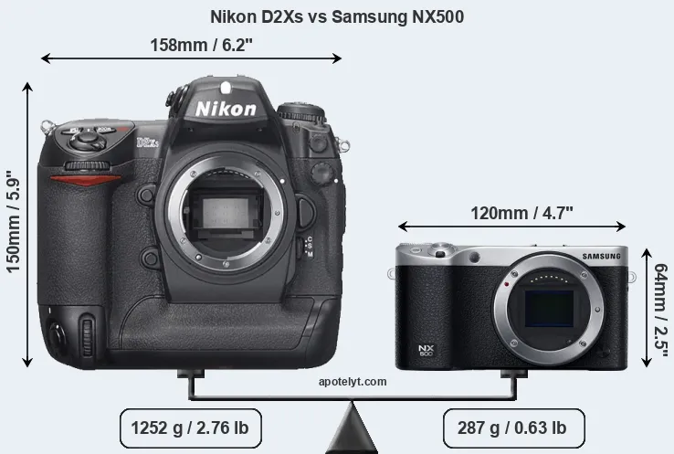 The physical size and weight of the Nikon D2Xs and the Samsung NX500 are illustrated in the side-by-side display below. The two cameras are presented according to their relative size. Three consecutive perspectives from the front, the top, and the back are available. All width, height and depth measures are rounded to the nearest millimeter.