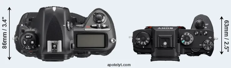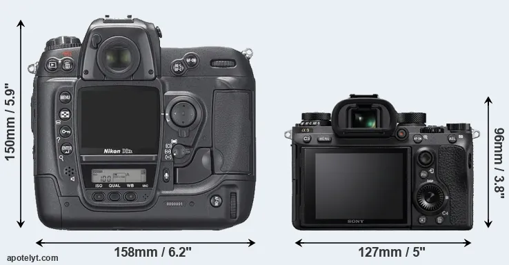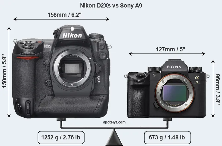 The physical size and weight of the Nikon D2Xs and the Sony A9 are illustrated in the side-by-side display below. The two cameras are presented according to their relative size. Three consecutive perspectives from the front, the top, and the back are available. All size dimensions are rounded to the nearest millimeter.