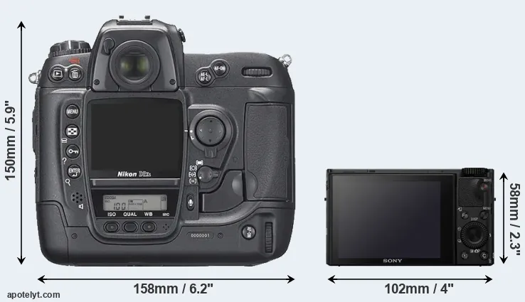 The side-by-side display below illustrates the physical size and weight of the Nikon D2Xs and the Sony RX100 IV. The two cameras are presented according to their relative size. Three consecutive views from the front, the top, and the rear side are shown. All width, height and depth dimensions are rounded to the nearest millimeter.