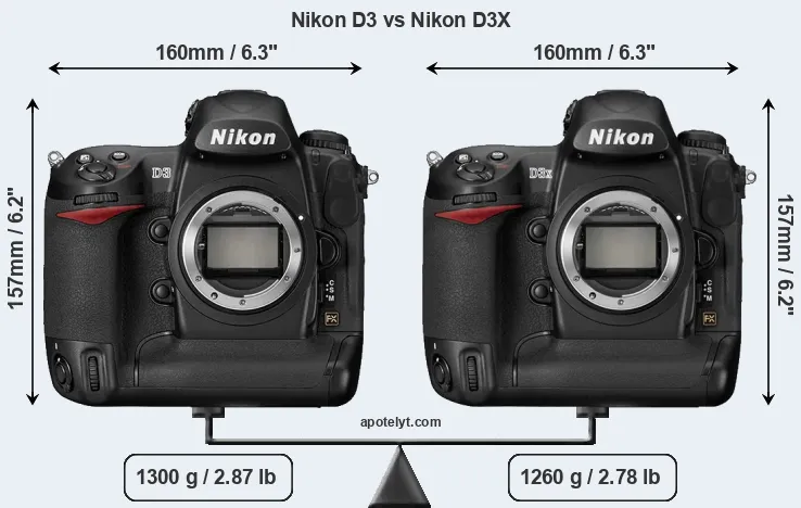 In this particular case, the Nikon D3 and the Nikon D3X have exactly the same width and height, and, thus, have identically-sized bodies. However, the D3X is slightly lighter (3 percent) than the D3. In this context, it is worth noting that both cameras are splash and dust-proof and can, hence, be used in inclement weather conditions or harsh environments.