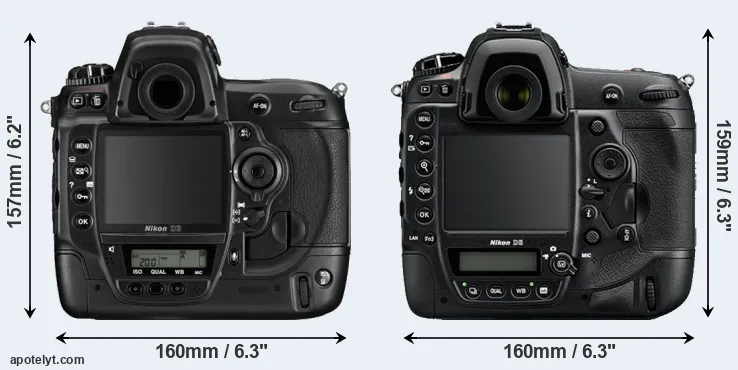 An illustration of the physical size and weight of the Nikon D3 and the Nikon D5 is provided in the side-by-side display below. The two cameras are presented according to their relative size. Three successive views from the front, the top, and the rear are shown. All size dimensions are rounded to the nearest millimeter.