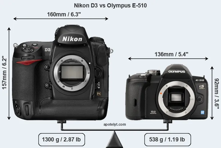An illustration of the physical size and weight of the Nikon D3 and the Olympus E-510 is provided in the side-by-side display below. The two cameras are presented according to their relative size. Three consecutive views from the front, the top, and the rear side are shown. All width, height and depth measures are rounded to the nearest millimeter.