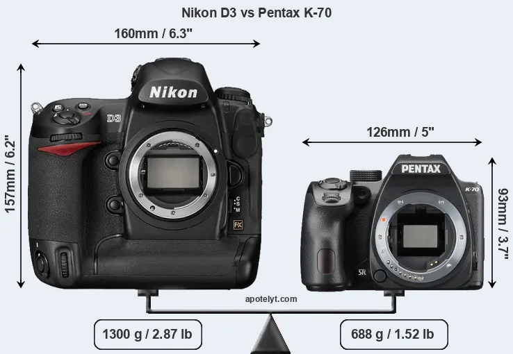 The side-by-side display below illustrates the physical size and weight of the Nikon D3 and the Pentax K-70. The two cameras are presented according to their relative size. Three successive views from the front, the top, and the rear are shown. All size dimensions are rounded to the nearest millimeter.