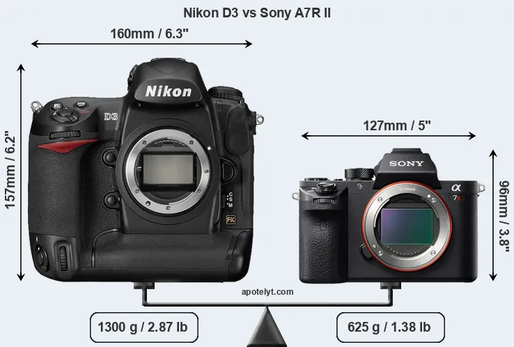 The physical size and weight of the Nikon D3 and the Sony A7R II are illustrated in the side-by-side display below. The two cameras are presented according to their relative size. Three consecutive perspectives from the front, the top, and the back are available. All width, height and depth dimensions are rounded to the nearest millimeter.