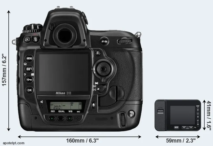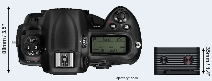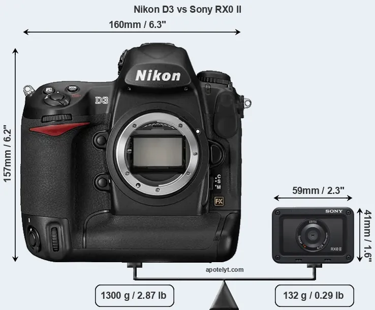 The side-by-side display below illustrates the physical size and weight of the Nikon D3 and the Sony RX0 II. The two cameras are presented according to their relative size. Three consecutive perspectives from the front, the top, and the back are available. All width, height and depth dimensions are rounded to the nearest millimeter.