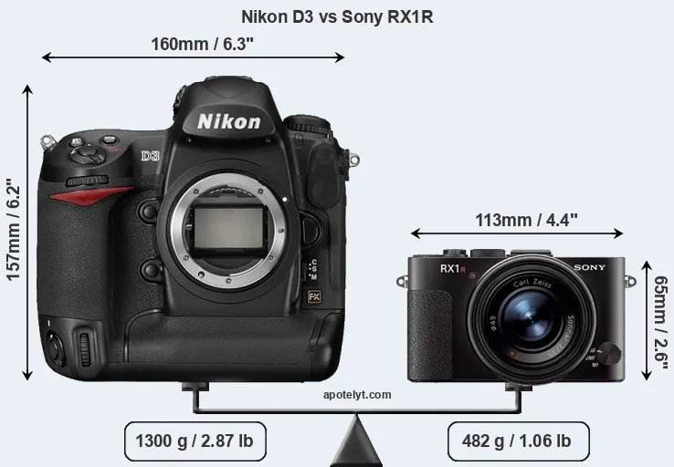 An illustration of the physical size and weight of the Nikon D3 and the Sony RX1R is provided in the side-by-side display below. The two cameras are presented according to their relative size. Three consecutive views from the front, the top, and the rear side are shown. All width, height and depth measures are rounded to the nearest millimeter.