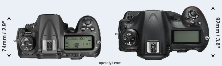 The physical size and weight of the Nikon D300 and the Nikon D5 are illustrated in the side-by-side display below. The two cameras are presented according to their relative size. Three consecutive perspectives from the front, the top, and the back are available. All width, height and depth dimensions are rounded to the nearest millimeter.