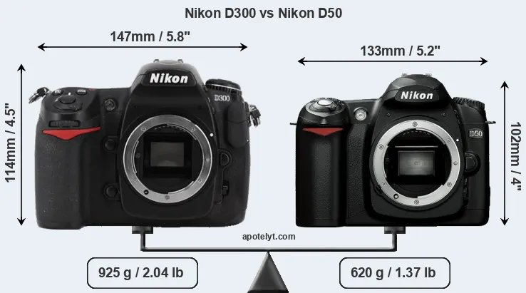 An illustration of the physical size and weight of the Nikon D300 and the Nikon D50 is provided in the side-by-side display below. The two cameras are presented according to their relative size. Three successive views from the front, the top, and the rear are shown. All width, height and depth dimensions are rounded to the nearest millimeter.